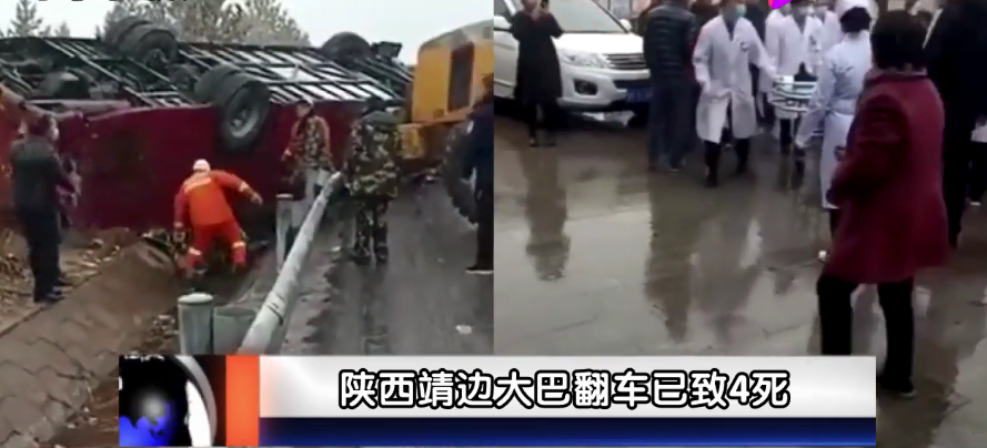 11月14日,陕西靖边一辆大巴车在高速上翻车。事故造成4人死亡,42人受伤。伤者中36人被送往靖边县人民医院,6人被送往靖边县中医院。该大巴所属公司称,车辆系宁夏青铜峡市委组织部包车,车上乘客多是当地各个单位的公职人员。