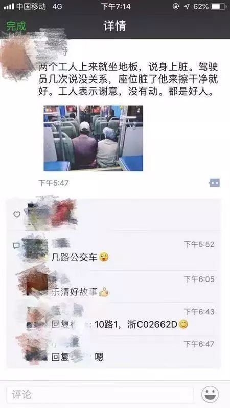 当时车上乘客并不多,疏疏落落坐着几个人,驾驶员李师傅看到后,多次邀请他们坐到座位上,可两位乘客却说自己衣服脏,宁愿挤在过道上也不愿意弄脏座位。