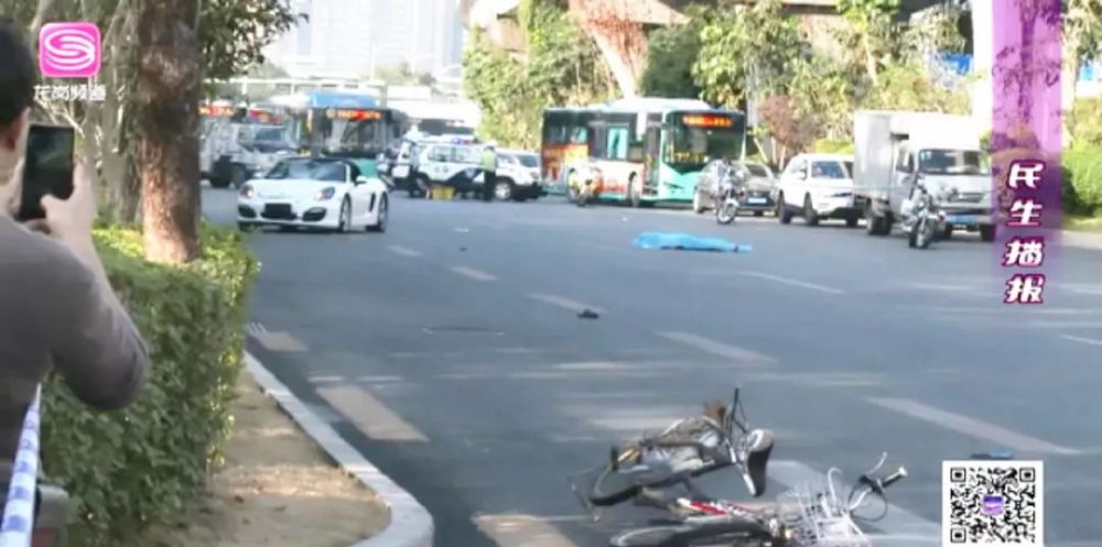 根据目击者介绍,事发当时,这名骑自行车的男子从南联市场买完菜后准备横穿龙岗大道并逆行一段到前方红绿灯路口的马路对面去,不料竟被飞驰而来的保时捷当场撞飞了……