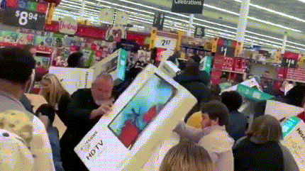 大门被挤垮、商品货架被撞倒、人们摔倒的场景只是黑色星期五在正常不过的场面,还有些顾客同时看上了同一件打折商品,为了决定谁能买走,干脆就上演全武行、谁打赢了谁带走。