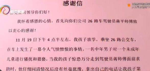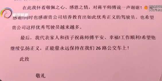 感谢信里,这位妈妈情真意切地写到:现在很多人都说世风日下,抱着多一事不如少一事的心态,不管闲事,然而从蒋师傅身上,我们看到了正义的化身,感谢蒋师傅在危急时刻保护了我们的女儿。