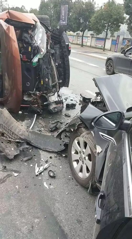 黑色车被撞停,而橙色车90度翻转,直直立在了路中央,两车几乎报废,一片狼籍。而两辆车中,分别有一位正要去医院看病的老人,一位1周岁多的宝宝。