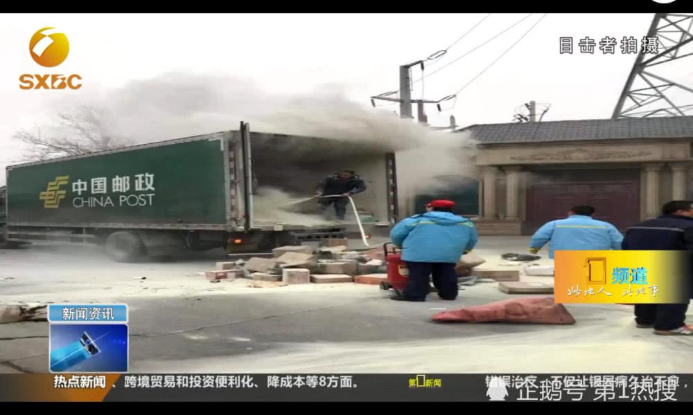 这辆快递车驶出加油站后,货车车厢一打开便有浓烟大量冒出。