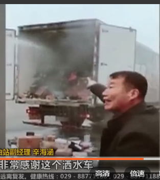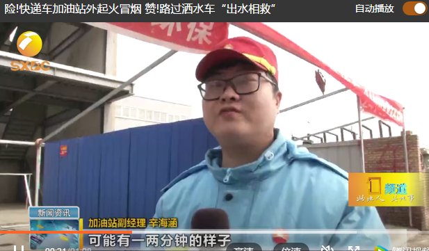 加油站副经理 辛海涵:刚好路过一辆洒水车 我们的人员就上前把这个车给拦住了 帮忙给我们灭这个火 也非常感谢这个洒水车能助我们一臂之力 从发现到整个善后工作处理完就十分钟