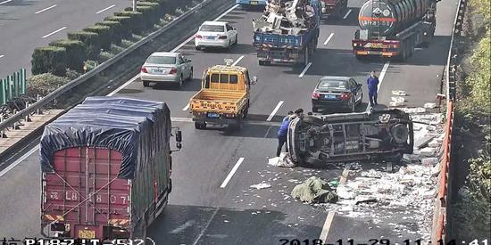 11月29日上午11时10分左右,一辆宁波号牌的黑色皮卡小货车行驶至杭浦高速公路往杭州方向过盐仓3公里处,因为炸胎急刹失控,在碰撞边护栏后车辆侧翻,车上所载的五、六十箱共计上万条小鲳鱼全部散落在高速路上。