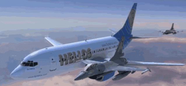 2005年8月14日上午9点07分,塞浦路斯一架波音737飞机起飞,途径雅典飞往布拉格。起飞一切顺利,但是不久之后接到机组报告,座舱内的空调系统故障,随后就与塔台失去了联系。但是雷达显示,飞机仍在正常飞行。上午10点37分,客机进入希腊领空,却没有按照规定下降高度,而是不断地在希腊上空盘旋。此时距离911恐怖袭击不久,希腊军方立即敏感了起来,莫非又是一起恐怖袭击?随后,两架F-16战机紧急起飞,前去查看到底发生了什么情况。
