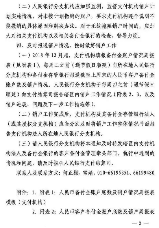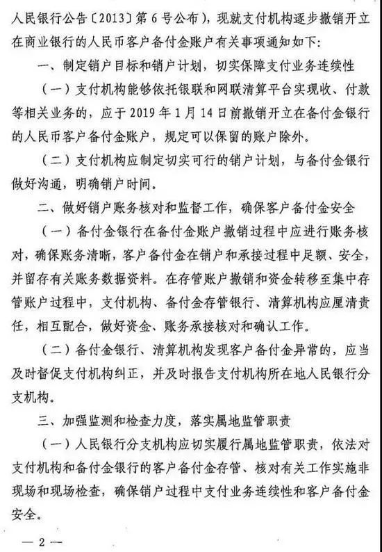 根据撤销备付金账户的通知,支付机构能够依托银联和网联清算平台实现收、付款等相关业务的,应于2019年1月14日前撤销开立在备付金银行的人民币客户备付金账户,规定可以保留的账户除外。