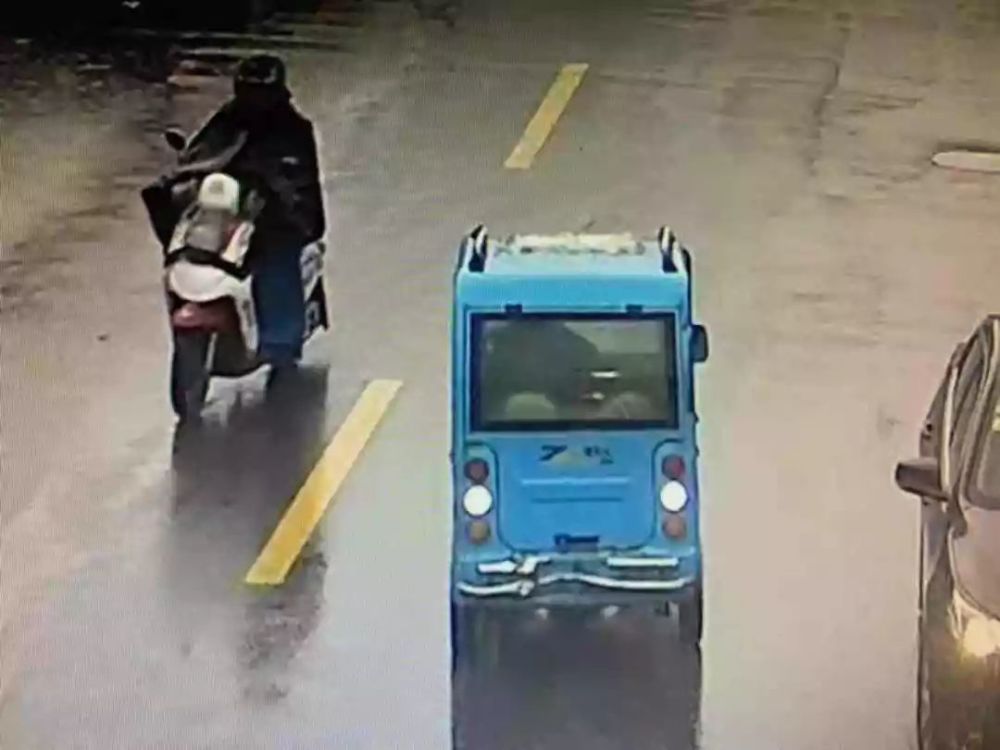 钱警官在事故现场发现了一面遗留的反光镜,以及一些蓝色的油漆碎片,并调取事发现场的一个村级监控,发现肇事的是一辆蓝色的全封闭电动三轮车!