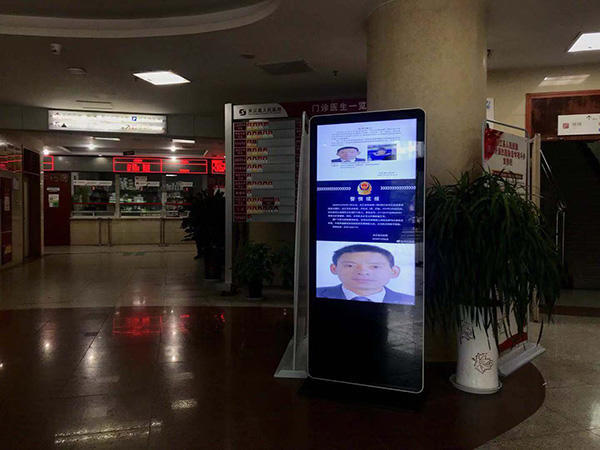 夹江县人民医院的通道边,显示屏上滚动发布对卢仕兵的悬赏通告。
