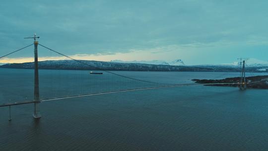 挪威哈罗格兰德大桥位于挪威北方港口城市纳尔维克市,跨越挪威北部奥福特峡湾,位于北极圈内,被称为“与极光相伴的桥”。大桥长1533米,其中主跨1145米,两侧主塔分别高172米和175米。大桥采用了独特的不规则空间主缆设计,从大桥上空俯瞰,两根主缆两头窄、中间宽,形似鱼腹。桥面钢箱梁由30个预制梁段组成,总重量约7000吨,两根主缆重约4000吨。