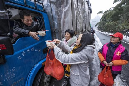 就在陈师傅打开饭盒,填补辘辘的肠胃之时,同时排队等候在这条道路上、长约6公里路段的货车司机们,亦相继收到了这份暖心午餐。一时间,雪天被滞留在外的种种困苦,仿佛都烟消云散,弥漫在他们心头的,是一股感恩的暖流。