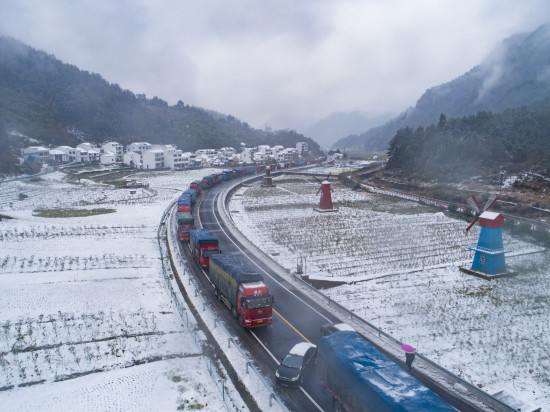 12月8日,浦江也飘起漫天大雪,山区地带更是在短时间内,就积起了厚厚的雪。傍晚起,位于山区的210省道虞宅乡马岭路段道,路积雪结冰现象严重。为确保安全,交通部门决定暂时封道,货车司机们就沿路停车,静候险情解除。一夜下来,这条路上的货车,已排起长约6公里的队伍,滞留货车约350辆,司机人数约420人。