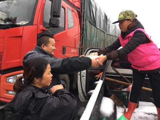 忙碌几个小时后,到了中午时分,志愿服务员出发了。他们分成几路小分队,沿着6公里长的路段,开着小货车或私家车,将打包裹好的400余份蛋炒饭,一一送到每位滞留货车司机的手中。“大哥,喝杯热水,吃碗炒饭,暖暖身吧!”听到这样的话语,很多司机都热泪盈眶。