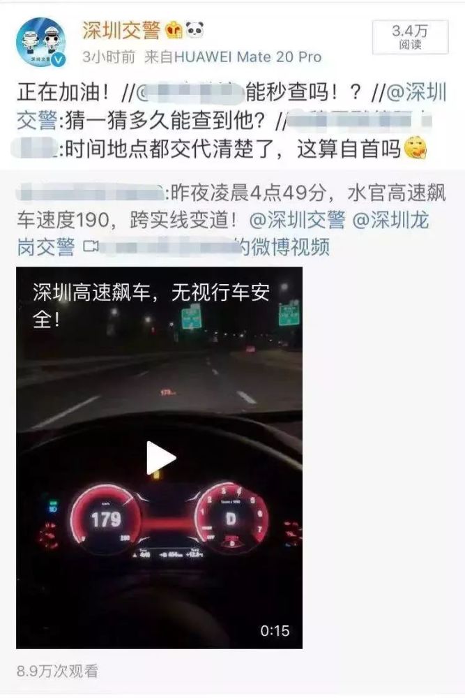 12月9日,市民通过微博@深圳交警,微博内容为一段车内拍摄的小视频,视频显示车辆在高速上快速行驶,车辆仪表盘上实时显示车速最高达到了200公里/小时,涉嫌超速驾驶。