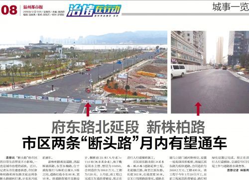 “断头路”给市民的日常生活带来不小影响,一直是城市治理的顽疾。近日,记者从市住建委获悉,市区新株柏路和府东路北延这两条断头路顺利打通,计划本月底前通车。