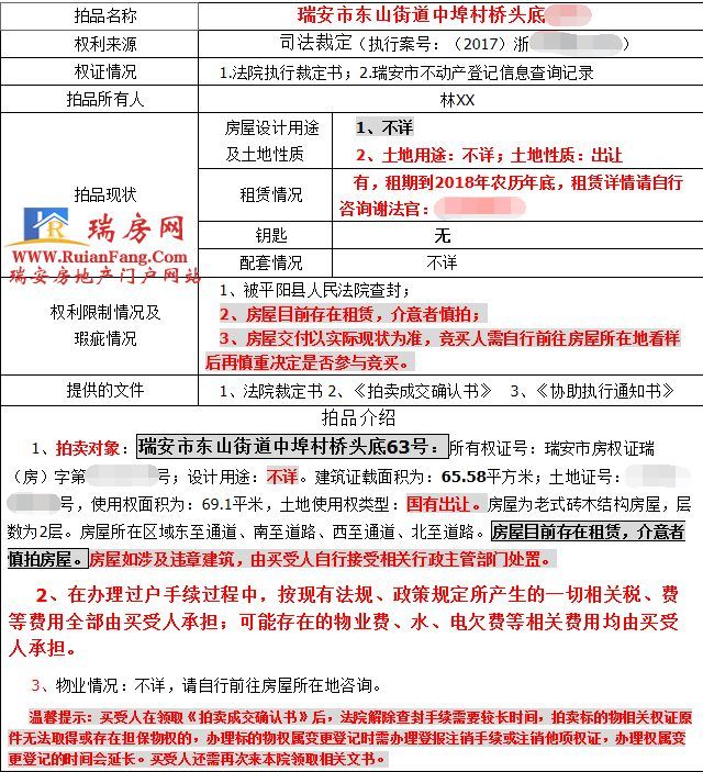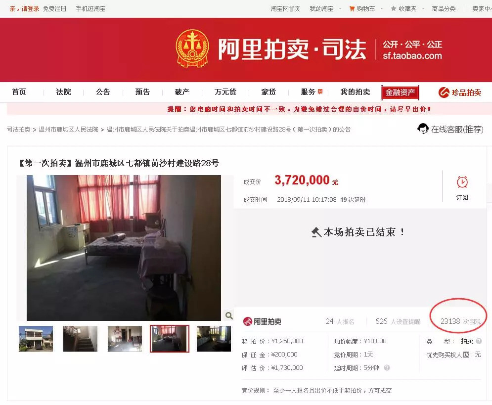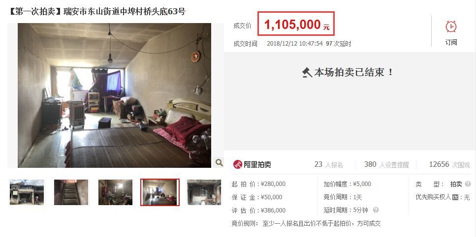 近日一套位于瑞安市东山街道中埠村桥头底的房子在淘宝司法网上拍卖,起拍价为28W,报名人数23人,围观次数达1.2W人次,经过97轮竞拍,最终以110.5W价位成交,溢价率达3倍左右。