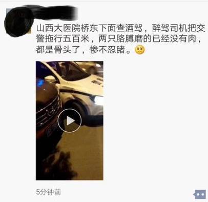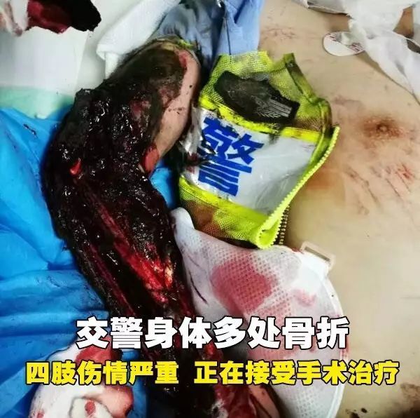 地上留下一条血肉模糊的痕迹,而交警的手臂已经露出森森白骨,腿也面临截肢风险,惨不忍睹!
