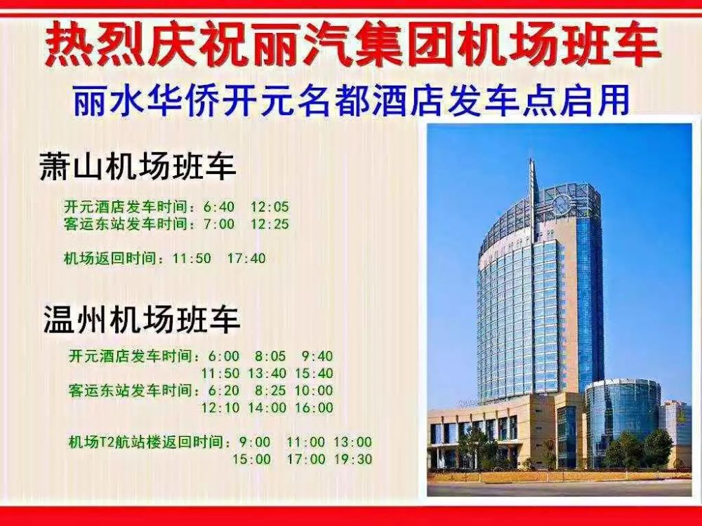 为更好地服务外地游客和丽水市民,方便旅客乘坐丽水至温州机场、萧山机场直达班车和从机场回丽水旅客到酒店住宿问题,从2018年12月18日起,丽汽集团至温州机场、萧山机场班线延伸至丽水华侨开元名都大酒店始发。班车从丽水华侨开元名都大酒店提早20分钟发班,到东站检票发班。回程班车到东站下客后,再把旅客送达丽水华侨开元名都大酒店。全程票价不变。
