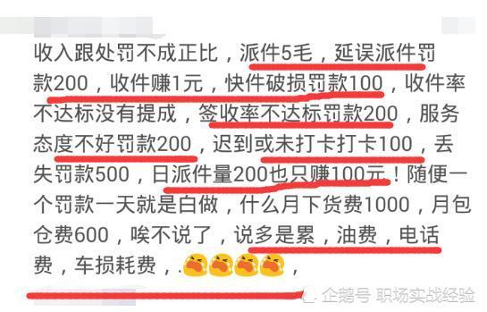 有位快递小哥也是爆料:收入跟处罚不成正比,派件5毛,延误派件罚款200,收件赚1元,快件破损罚款100,收件率不达标没有提成,签收率不达标罚款200,服务态度不好罚款200,迟到或未打卡打卡100,丢失罚款500,日派件量200也只赚100元!随便一个罚款一天就是白做,什么月下货费1000,月包仓费600,唉不说了,说多是累,油费,电话费,车损耗费!