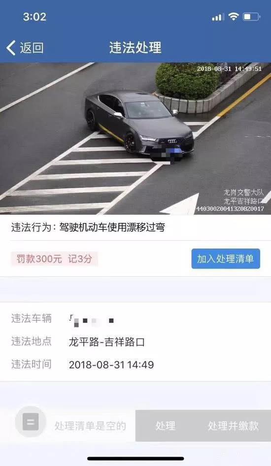 去年,一张深圳交警电子警察抓拍的违法图片在网络流传,图片显示一辆小车的违法行为竟然是“驾驶机动车使用漂移过弯”。违法地点为龙岗区龙平路吉祥路口,车牌被打上了马赛克,处罚结果为罚款300元,记3分。