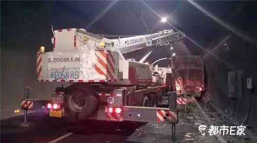 由于肇事现场处于隧道内,且被卡在隧道排水沟和隧道墙之间,给实施救援带来一定难度,现场被迫采取交通管制措施,经过多方努力,08时40分,车辆被吊车吊出沟内拖离现场,交通恢复正常通行。