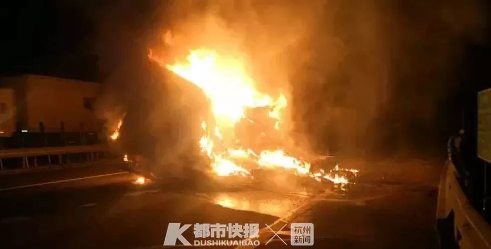 黄警官来到现场后发现一辆舟山牌照的小型箱式货车正冒着熊熊大火,火焰窜至八九米高,不间断的出现爆燃情况,远远的就能闻到一股烤螃蟹并混着机油的味道!鉴于货车火势太大,无法控制,黄警官只能先采取交通管制措施,避免后方来车被火势波及。