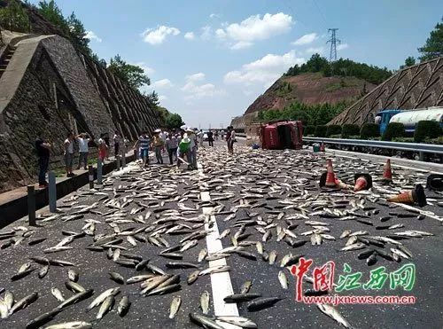 2015年8月1日13时许,江西省交警总队直属三支队第一大队值班室接到司机报警,称其驾车在沪昆高速公路弋阳段行驶时与一辆拉鱼的小货车发生刮擦,小货车失控侧翻,车上的鱼撒了一路,在高温下被炙烤。车上装有草鱼约8800斤,价值6万元。车子一翻,鱼全撒到路上死了,还好人无大碍。