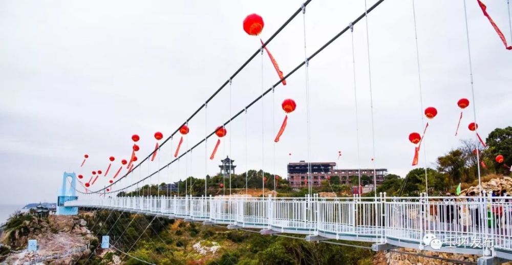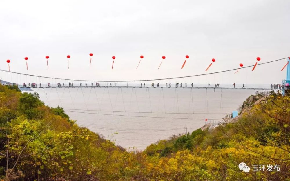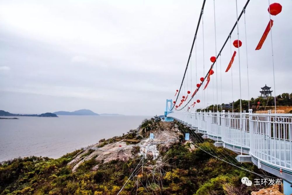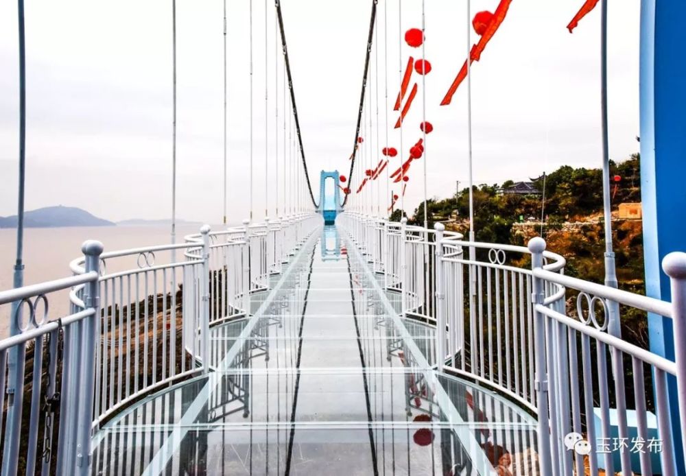 这是玉环首个玻璃吊桥,同时也是中国首座滨海玻璃吊桥。它,面朝大海,飞架于悬崖峭壁之上。 全长138米,宽2—3米,桥面至谷底垂直高度达70米,总投资600万元,采取村集体出资+村民集资的方式,历时7个月工期。