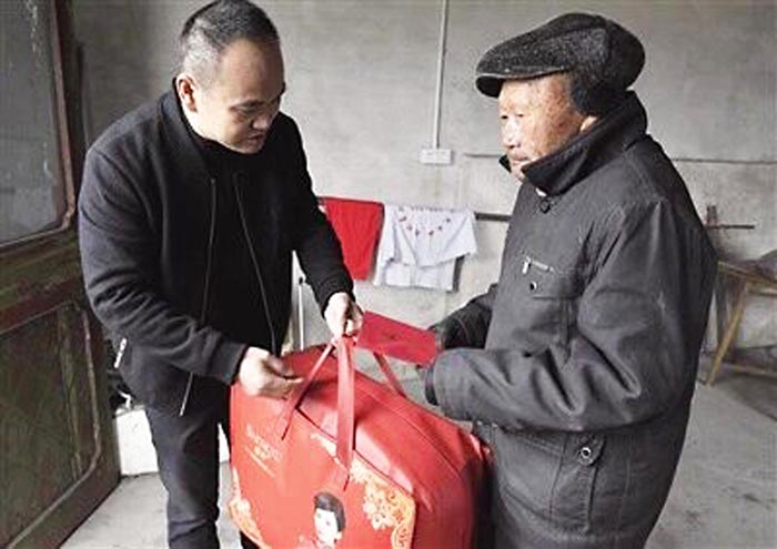 随后,志愿者一行又来到了金乡镇灵峰村陈登焕的家中。知道志愿者要来,他早早就站在门口迎接了。“陈老伯,我们来给你送温暖啦!”在送上“爱心邮包”和慰问金后,温州困难群众帮扶服务中心的工作人员还给陈老伯铺上了新棉被,“加了新被子,这个冬天就不会冷了。”陈老伯看到那么多人来看他,激动地流下了眼泪,并与在场的志愿者一一握手,不停地用当地方言说着谢谢。灵峰村党支部书记董门元介绍,陈老伯今年88岁,是名孤寡老人,平日靠捡破烂维持生计。“你们的看望,可以让他开心好一阵子了!”