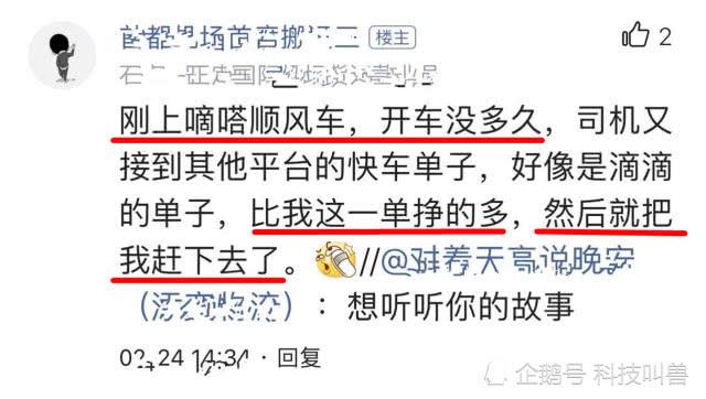 网友一:我跟你有类似的经历,也是上车没多长时间,司机好像接到滴滴给派的单子,是个快车,钱数上比我的这单多,直接就把我赶下去了,很无语,当时脑子都懵了。