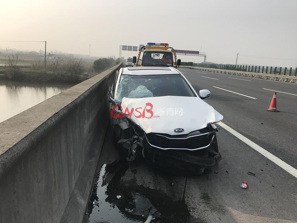 执勤民警到现场之后,发现一辆宁波牌照的小轿车紧贴着右侧的水泥护栏,浑身是伤,半截车身已经报废,驾驶员陶某在护栏边上焦急地等待高速交警救援。经检查,人没大碍。