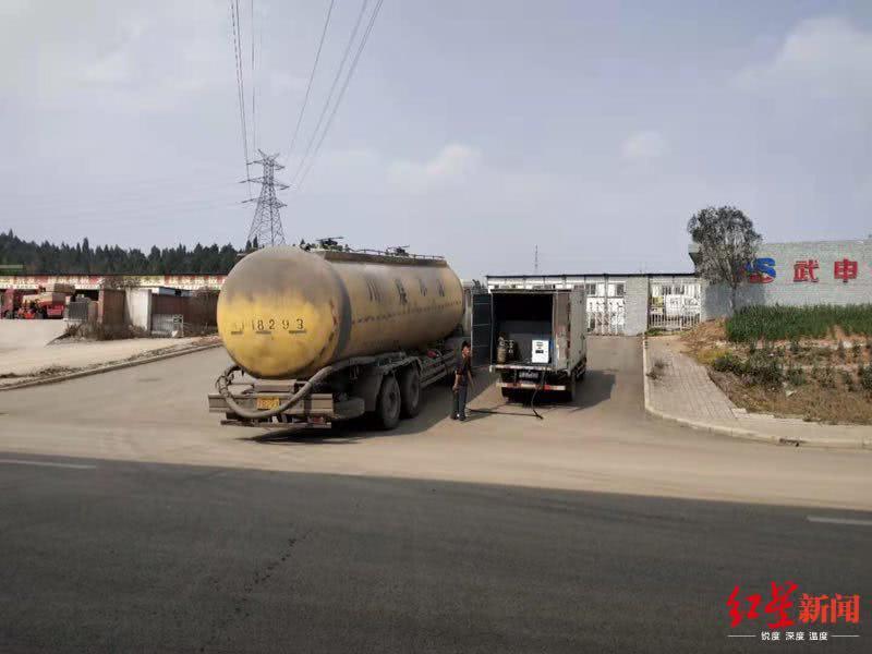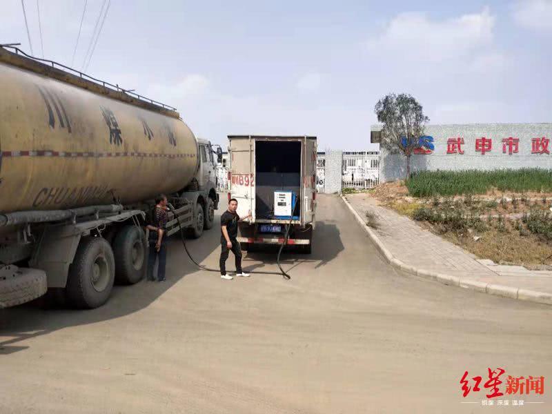 一辆厢式货车,伸出一根连接管后,竟然直接跟旁边的水泥罐车加上了油……
