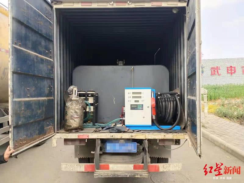 经民警仔细查证,两车确实正在进行加油操作,民警发现,厢式货车内暗藏“玄机”,车厢内有一个大型储油罐,并且储油罐底部有一根导管,连着一台小型加油机,上面显示着加油量和单价数目。