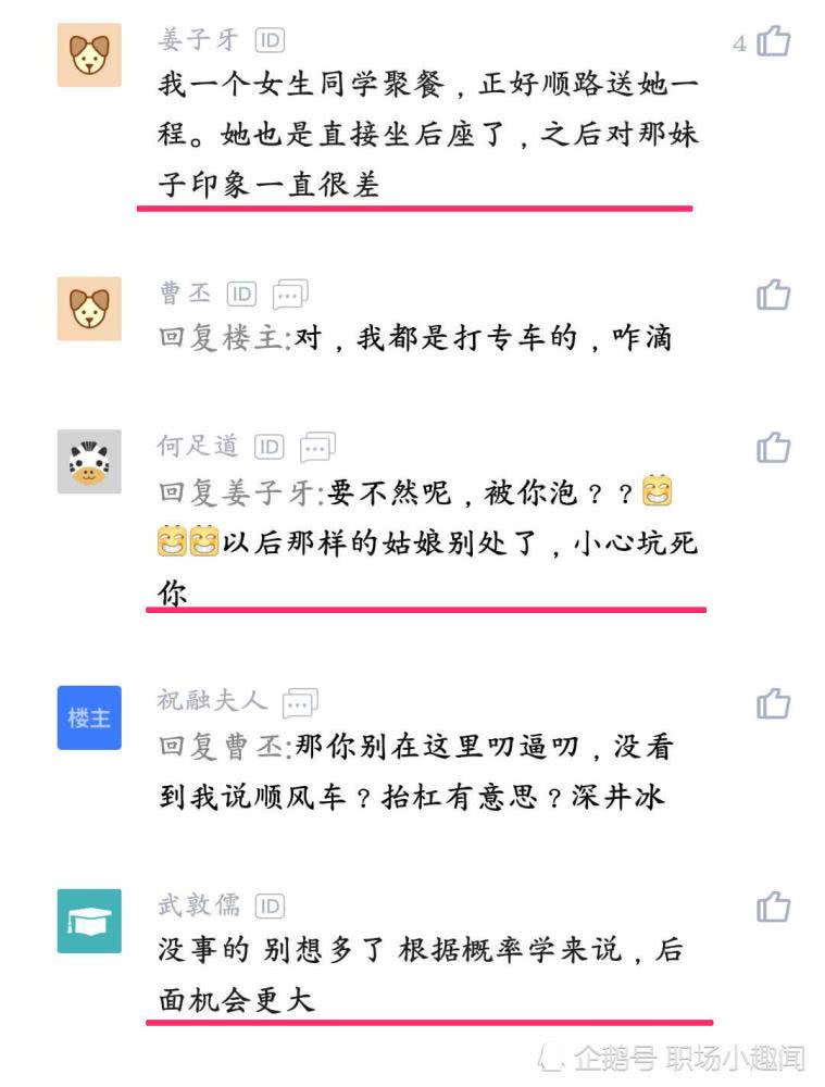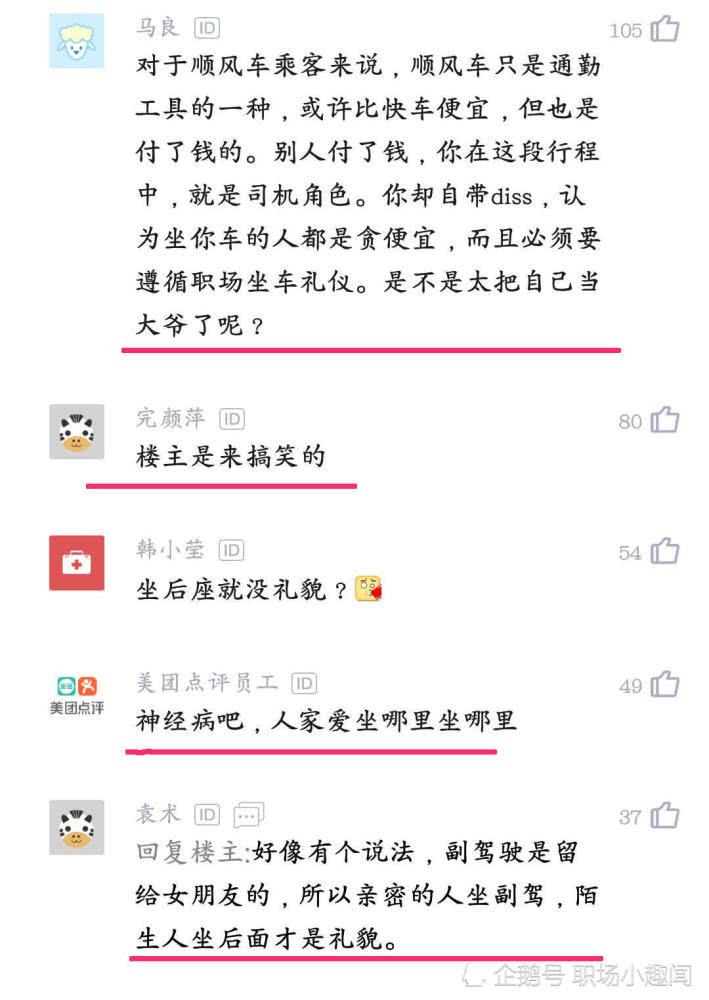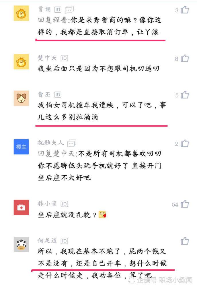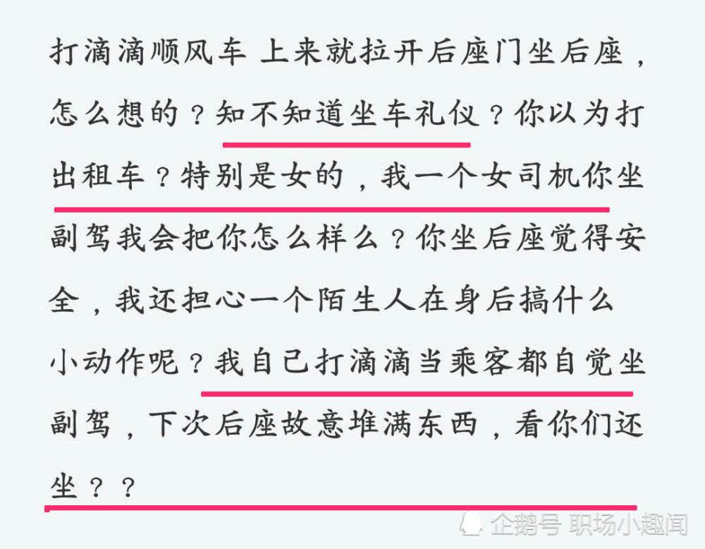 对于这位滴滴女司机而言,或许因为自己只是顺路接了一下顺风车的单而已,并没有把自己当成滴滴专职司机或许出租车司机那样,以跑滴滴为生,所以,乘客并不能把自己当成一个普通的滴滴司机或许出租车司机,所以,在滴滴女司机看来,乘客更应该按照职场的坐车礼仪来对待自己,更应该上车之后坐在副驾驶的位置,而不是坐在车的后座!