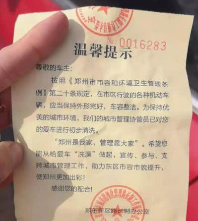 郑东新区是河南省郑州市规划建设中的一个城市新区,他们坚持的是绿色发展理念,着力发展成为国际化的区域性金融中心和具有国际水平的生态宜居城市。所以郑东新区不仅非常重视经济发展,而且对于城市的市容市貌也是异常的注重,为了创建一个良好的城市环境,当地政府花费了很大的精力。由于车身肮脏的汽车在城市里行驶非常影响城市的形象,所以郑东新区政府雇佣了专人到街道上对那些车身非常脏的车辆进行清洗。在清洗完车辆后清洗人还会在车身上放上一张提示单,提醒车主自觉保持市容,保持自己车辆的洁净。