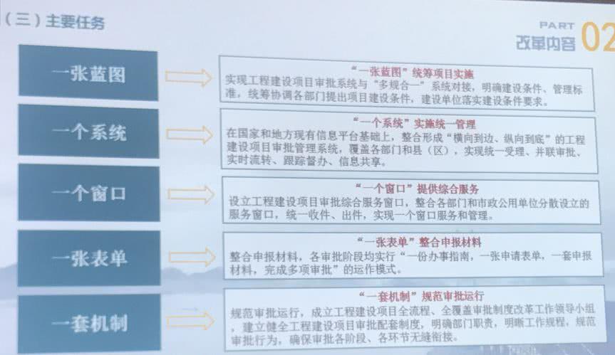 方案提出,打造浙江省工程建设项目审批管理系统,整合施工图联审系统、“竣工测验合一”办理系统和其他相关业务办理系统打造“五个一”的审批体系,即“一张蓝图”统筹项目实施,“一个系统”实施统一管理,“一个窗口”提供综合服务,“一张表单”整合申报材料,“一套机制”规范审批运行。