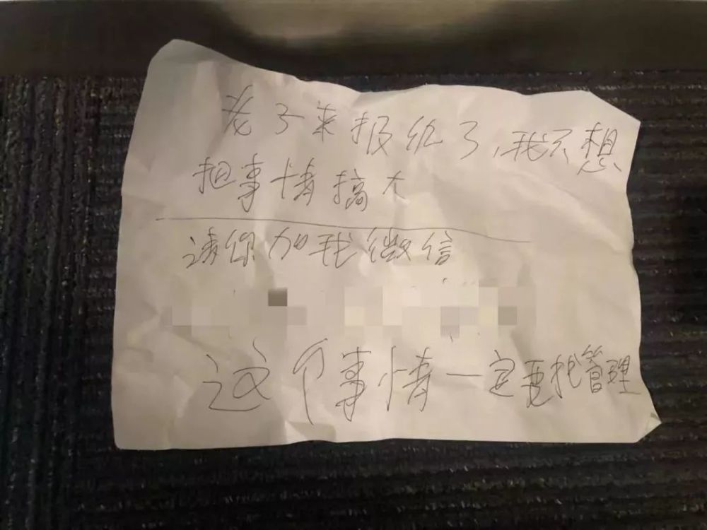 其中一张上面歪歪斜斜的写着:老子来报仇了,我不想把事情搞大,请你加我微信187*******,这个事情一定要找管理。