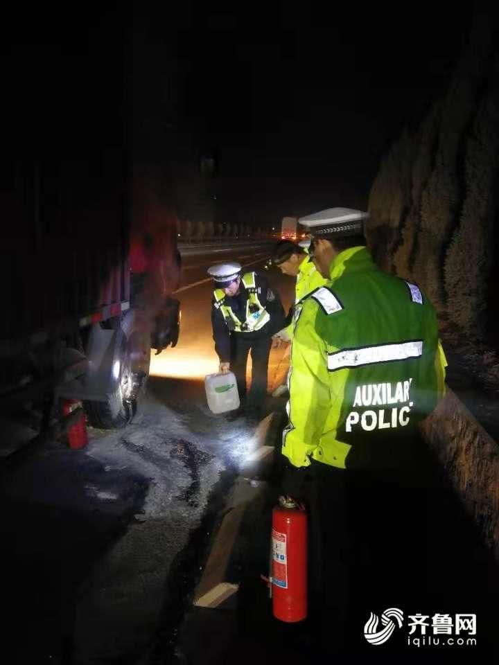齐鲁网3月24日讯3月24日凌晨3时许,一辆重型货车行驶至G15沈海高速(南向北)626公里处时,驾驶员孙师傅发现驾驶室下方散发出一股呛人的烟味,下车查看后才发现右前轮胎着起了火苗,为了安全,便赶紧用携带的灭火器和备用水灭火施救。