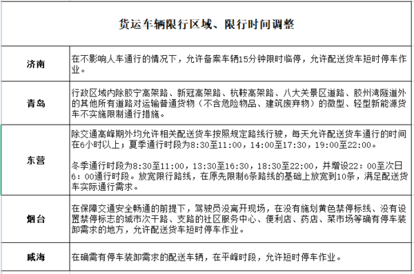 济南、青岛、淄博、枣庄、东营、烟台、泰安、威海、日照、临沂交警进一步优化配送货车通行证网上申办工作,为通行备案网上办、掌上办提供政策支持。