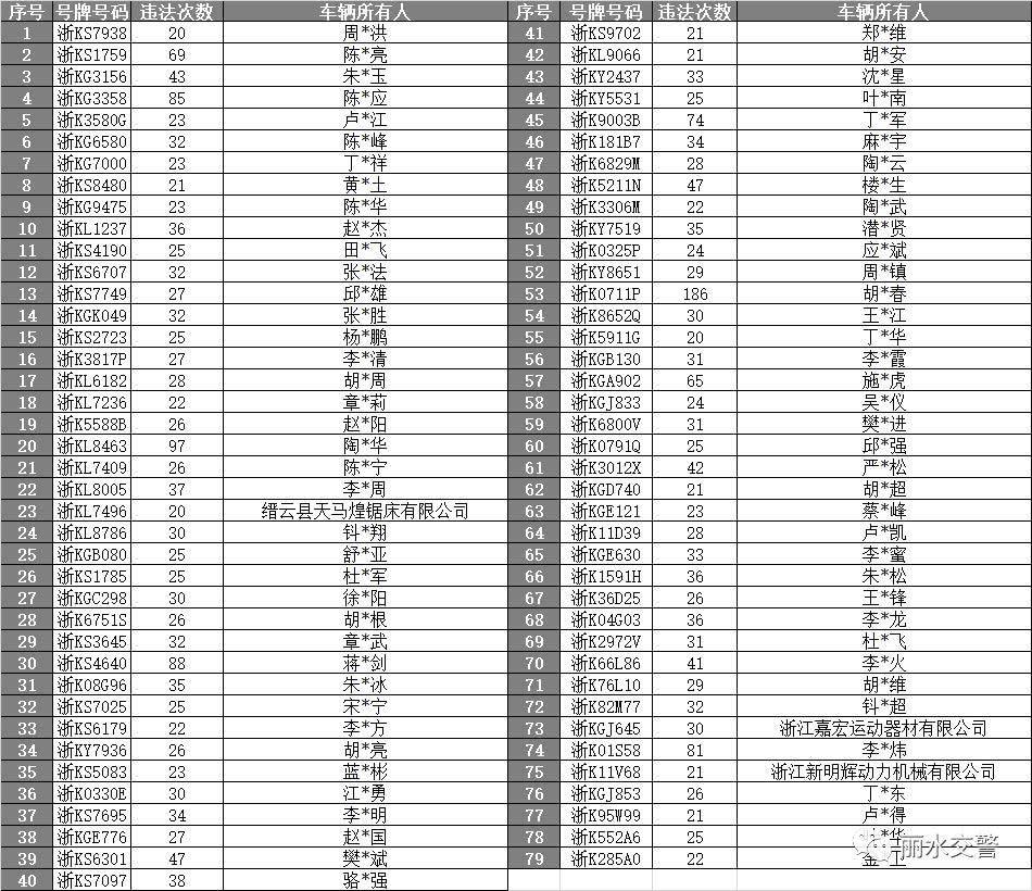 截至11月21日,光缙云20次及以上交通违法未处理的车辆就有79辆,名单如下: