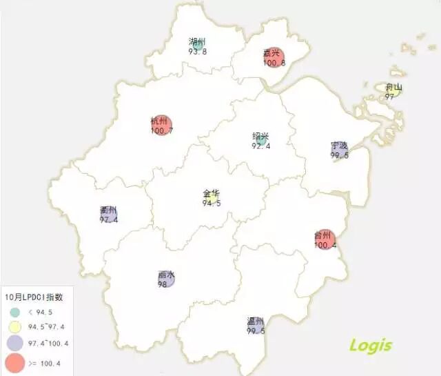 浙江省2017年9-10月物流岗位需求数据显示,浙江省LPDCI指数为99.3,其中,嘉兴、台州、杭州LPDCI指数均大于100,其10月物流人较9月略有增加,其他城市10月物流人需求均呈现不同程度的减少趋势。杭州、宁波、温州是浙江物流人才需求的大本营,如图8所示。
