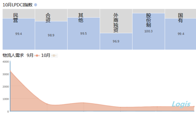 由图3可以看出,浙江省10月不同规模企业中500-1000人规模企业LPDCI指数最大,其10月需求略有增加,其他规模企业10月需求均有所减少,5000-10000人、10000人以上规模企业减少幅度较大。10月不同规模企业中,100-500人规模的企业物流岗位人数需求最多,其次为100人以下规模的企业物流人需求最多,5000-10000人需求最少。