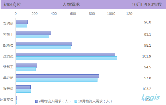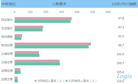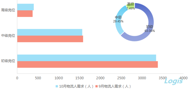 由图7可以看出,物流总监需求几乎无变化,其他岗位10月需求较9月均呈现大幅度的增加趋势。10月需求物流人需求较的是高级物流经理、高级物流主管。